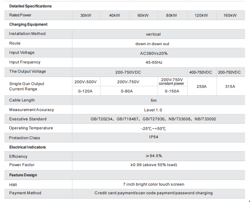1) Phạm vi công suất trạm sạc: 30kW ~ 160kW.